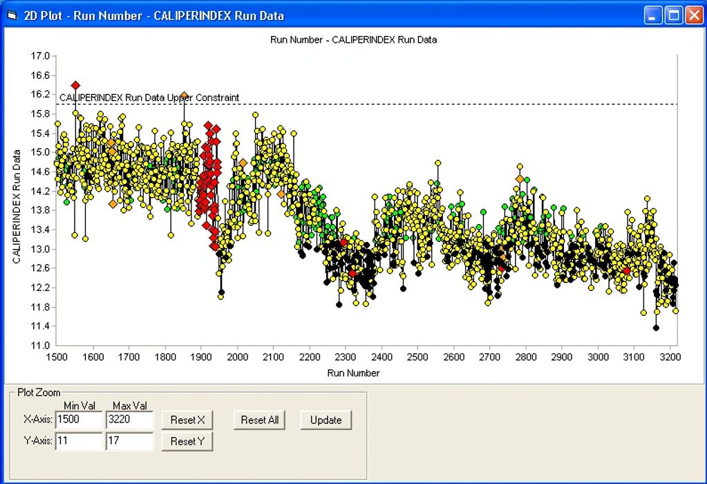 Caliper Index reduction profile in glass mat line optimization. Black points represent best achievable results given external conditions.